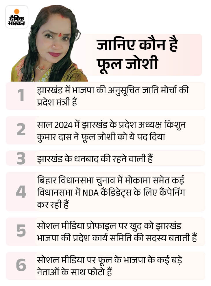 भास्कर के कैमरे पर यह दावा करती बीजेपी लीडर फूल जोशी हैं, जो झारखंड में पार्टी की अनुसूचित जाति मोर्चा की प्रदेश मंत्री हैं। केंद्रीय नेतृत्व के आदेश पर वह बिहार विधानसभा चुनाव में ‘जय भाजपा, विजय भाजपा’ अभियान चला रही हैं।